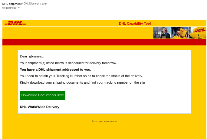 DHL Spear Phishing to Capture Username/Password, (Sun, Feb 13th) Feb 13, 2022 This week I got this run-of-the-mill DHL phishing in my ISC inbox. http://news.poseidon-us.com/SJvW54