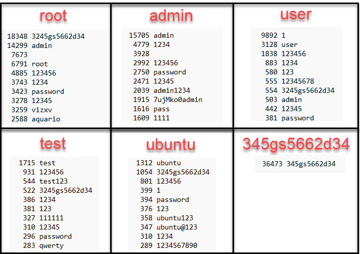 Based on reader feedback, I decided to take a look at usernames submitted to honeypots. The usernames that are seen on a daily basis look very familiar. They tend to come from default user accounts, such as “administrator” on Windows systems or ”root” on Linux systems. The knowledge of a default user account can help in brute force attacks. If the username is already known, only the password needs to be guessed. This shouldn't be too much of a problem to users as long as strong passwords are chosen or other authentication methods such as public key authentication is used. Setting up public key authentication is also referenced in our DShield setup instructions for a Raspberry Pi [2].