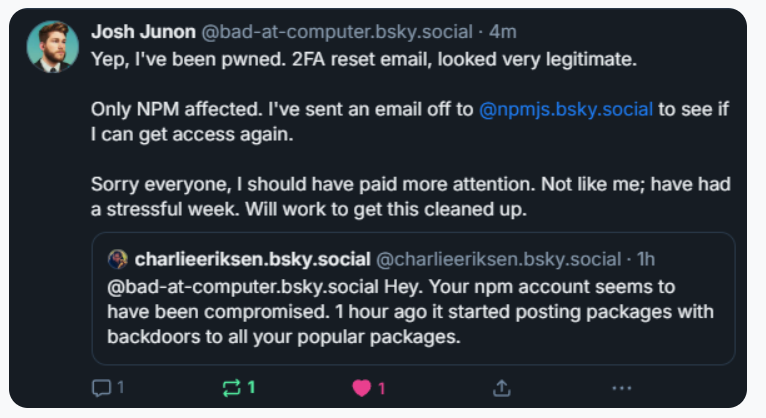 At least 18 popular JavaScript code packages that are collectively downloaded more than two billion times each week were briefly compromised with malicious software today, after a developer involved in maintaining the projects was phished. The attack appears to have been quickly contained and was narrowly focused on stealing cryptocurrency. But experts warn that a similar attack with a slightly more nefarious payload could quickly lead to a disruptive malware outbreak that is far more difficult to detect and restrain.