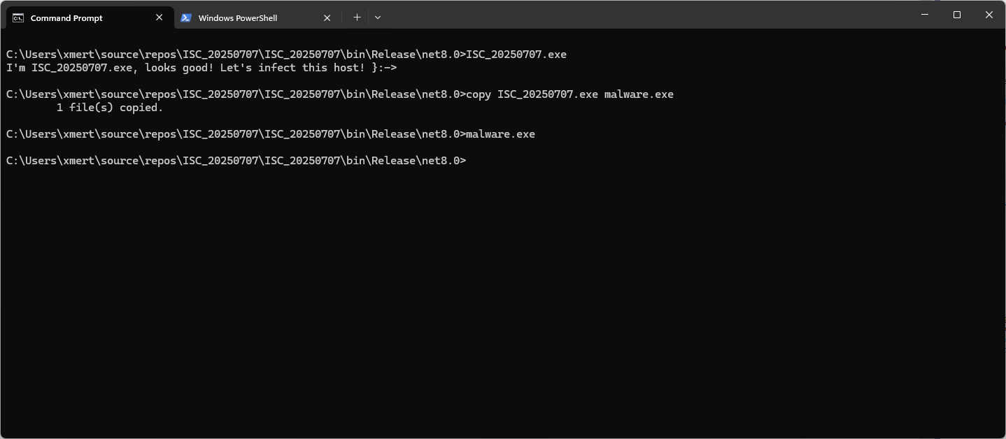Modern malware implements a lot of anti-debugging and anti-analysis features. Today, when a malware is spread in the wild, there are chances that it will be automatically sent into a automatic analysis pipe, and a sandbox. To analyze a sample in a sandbox, it must be “copied” into the sandbox and executed. This can happen manually or automatically. When people start the analysis of a suspicious file, they usually call it “sample.exe”, “malware.exe” or “suspicious.exe”. It's not always a good idea because it's can be detected by the malware and make it aware that “I'm being analyzed”.